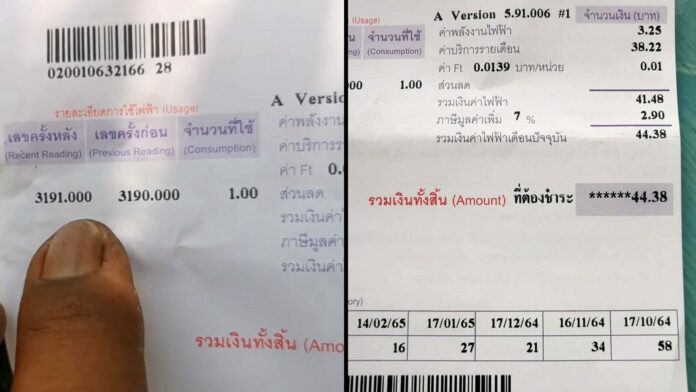 พร้อมพาไปดูว่า ไฟที่ผลิตใช้ตั้งแต่ต้นเดือนจนถึงวันที่ 17 เมษายนนั้น เป็นไฟกี่หน่วยเมื่อเทียบกับการไฟฟ้าและตีเป็นเงินจำนวนเท่าไหร่ ผลคือใช้ไฟไป 991 หน่วย หากตีเป็นค่าไฟก็เกือบ 4,000 บาท แต่พอติดตั้งระบบโซลาร์เซลล์ตนก็จ่ายค่าไฟแค่ 44.38 บาทเท่านั้น